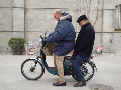 It was another bright and sunny day in Beijing with the temperature still well below freezing. The sky was a beautiful blue with no clouds in it. Andrew wanted to hop on the back of my bike and go for a ride to the fabricator as I wanted to change the design of the insert for the back of the spermoids slightly and to deliver the hinges that had previously purchased. We went about 30 feet and Andrew said stop. [picture] He was concerned that his 220 pounds, when combined with my weight, was too much and he felt unsafe. His rationale was that these bikes were designed for two Chinese persons and their combined weight was probably well under 300 lbs.