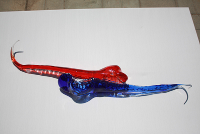 We did a number of sculptures on the new mold utilizing dark green and dark blue. Some were just the pure colors. Others were the use of these colors as a base with white frits. I hope they come out well. I also found the right size metal rod to make a slight indentation in the “face” of the spermoid to give a suggestion of eyes. Once the sculptures are delivered I will see whether this slight modification works. We also did a series of sculptures that had a white base with green frits and followed that up with a white base and dark blue frits.