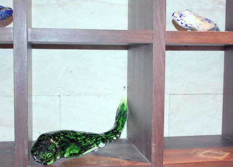 It is a magnificent area, and three blue and white “whales” would look good. There is a dark wall in a seating area at one end of the pool that would have been perfect for three of my blue and white whales glass sculptures. It could be seen not only in the entire pool area, but in the gym that was on the other side of the pool. Everyone thought the sculptures were beautiful, however there was a major problem. When we put in a hook to hang the first sculpture, the wall crumbled. It was apparently made of a very thin type of fiberboard that could not support anything. I tried to explain to them that if we could find a place where I could buy a toggle bolt, maybe we could hang the sculptures. The engineer said that the wall would not hold anything, so after 30 minutes we decided that we would not try to hang the sculptures on that wall. They did tell me that they were going to rebuild the wall in solid wood so that they could hang the sculptures in that area, because they looked so good there. I told them I would trust them on how to hang them, because I would be returning to the U.S. in a few days. I ended up spending four hours there going over other areas where the sculptures should go, because they agreed that they deserved to be on the wall so that they would be “swimming in space.” Two sculptures were set aside to go into the new Japanese room. This is a special combination private sauna for two people that is very luxurious and the sculptures were to be hung in such a way that while people were relaxing they would be looking at the sculptures. The construction was still incomplete, so it was decided not to hang the sculptures until the construction in that room was completed.