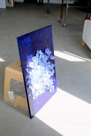 I woke up to a traditional Beijing sandstorm. It was like being on another planet. It was the perfect day to work in the studio on the Shattered Dream series set of sculptures. You go with the weather, since going outside was impossible. I pity the persons who have to commute to work by walking or bicycle. Initially I worked on epoxying a shattered blue Chinese Dragon to a gold painted board. It is another variation of my recycling steel that no one wants. The pieces of broken glass, just by themselves and especially in the light, are beautiful.