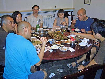 I had a nice visit with Julie, the owner of Topredart. Fortunately, she decided to spend the afternoon at the front desk rather than her upstairs office so she would meet the people coming in the gallery, as she thought this would encourage more business. She said our meeting was karma. We had a very nice visit and I asked her to come to the show the next day. I then took a taxi back to BIAC. It was raining so I decided to visit Huang and Li Gang who were hanging out in Huang’s studio rather than riding home in the rain. Huang had a photographic print in the Boston High Tea show at 2 Lines, which was hung next to my sculpture in the hallway leading up to the gallery entrance. Lu Zinmong and a group of other artists, including a visiting artist from Seoul Korea, were just hanging out. We decided to go to dinner at a converted stagecoach post office in the Wanjin district, just off the Airport Expressway. Since there wasn’t enough space in the cars, Li Gang, his assistant and I took our bicycles. The restaurant was a series of private buildings surrounding a courtyard which was quite beautiful and interesting. From the outside you had no idea what this was a or what was inside. The food was very spicy. The rainfall was torrential, so we decided to stay until it stopped.